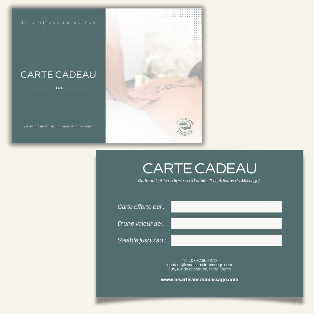 Offrez un moment de sérénité à vos proches. Nos cartes-cadeaux massage vous permettent d’envoyer un instant de détente personnalisé, directement dans leur boîte mail.