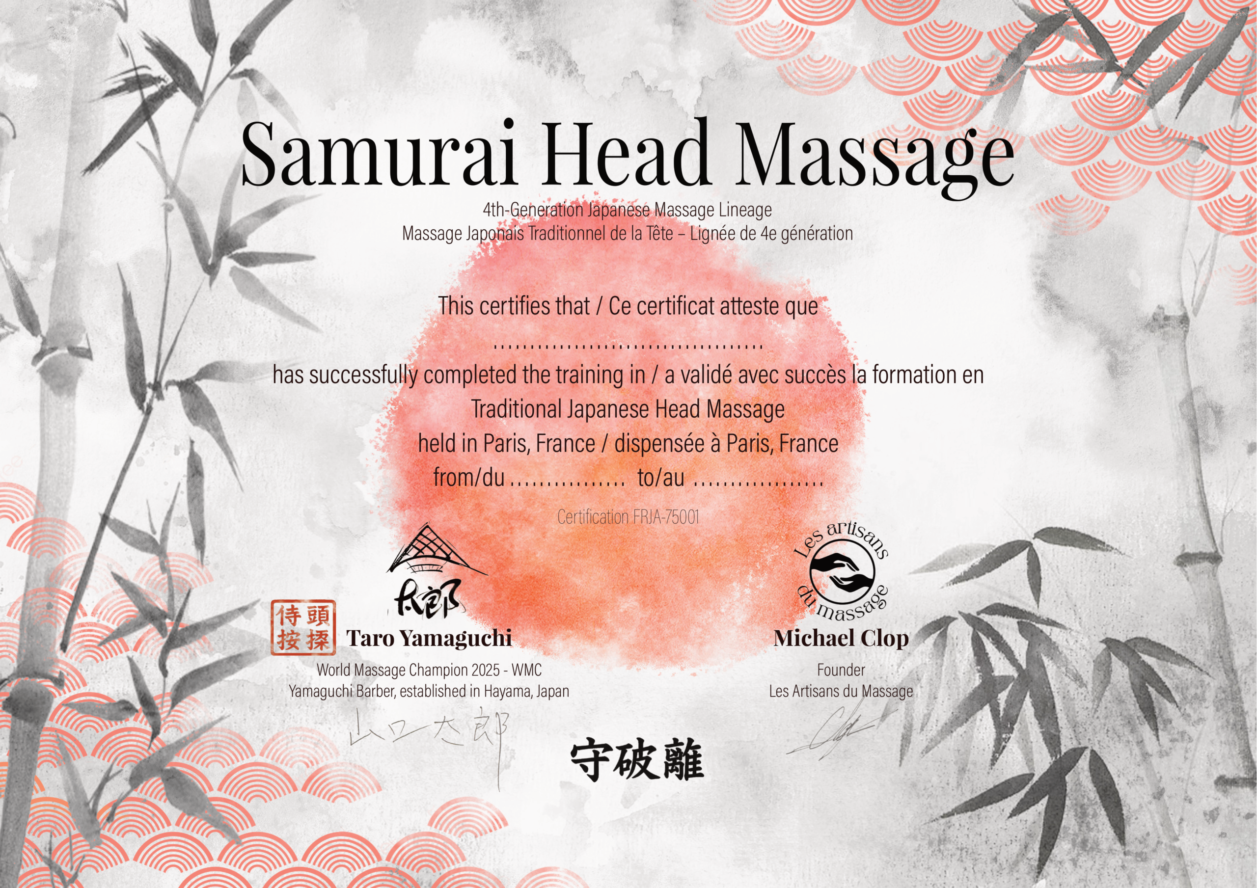 Devenez praticien certifié d’un art japonais hérité de 4 générations transmis par la main du Maître Taro Yamaguchi — Champion du Monde 2025 au World Massage Championship